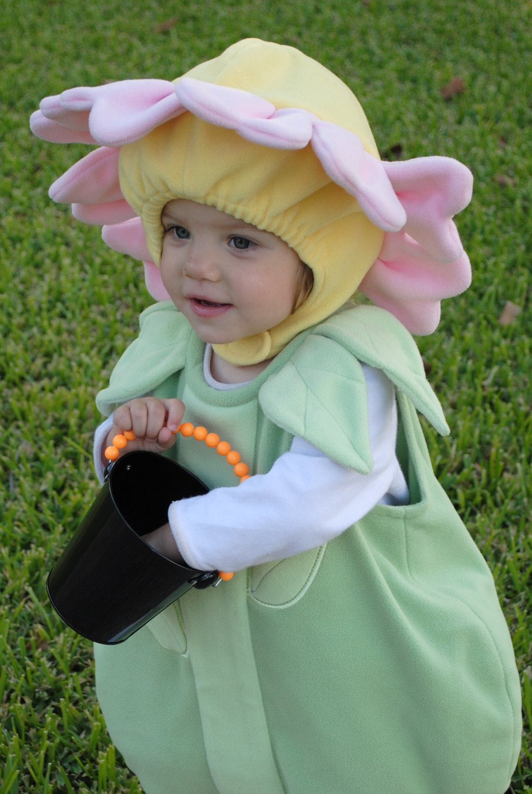 Kendall & I were sooooo happy to be getting out of the house & going to school on Thursday ... 4 days of sickness, little sleep, fever & crankiness was about all the both of us could stand! At pre-school on Thursday, it was "Dress-Up Day" ... so all the kids wore their halloween costumes & we had a mini-carnival & party that afternoon. Kendall wore her flower costume for part of the day ... she really doesn't enjoy wearing the head piece, which is the actual flower part ... so without it on, she was more like "a stem"! (I bought this Children's Place costume for $7.50 at a consignment store last year ... it's a 12 months, but it was huge on her ... the snaps that fit in between her legs hung down past her knees, but she didn't seem to mind that part of the costume too much!) Kendall's teacher, Miss Dee, gave her a pumpkin full of goodies for Kendall & her parents ... animal crackers, gold fish, puffs, yogurt melts & some candy ... she loved going through everything & eating some of the treats, too!